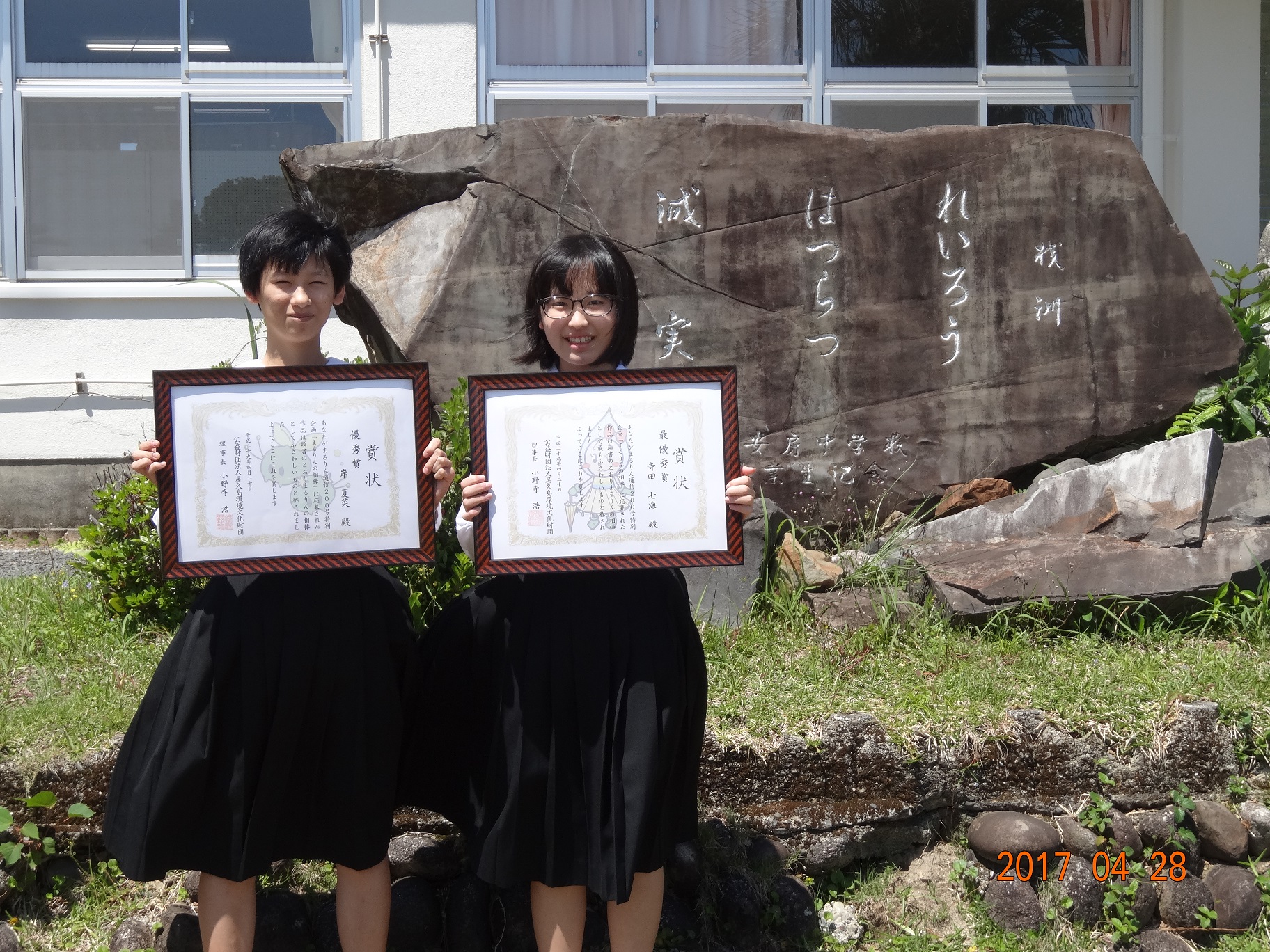 平成29年4月20日(木)に安房中学校校長室において,まるりん通信200号記念企画「まるりん相棒」募集で,最優秀賞を受賞した寺田七海さん(写真 )と優秀賞を受賞した岸夏菜さん(写真 )の表彰式を執り行い,応募したキャラクターが差し込まれた賞状と副賞の図書カードを手渡しました。