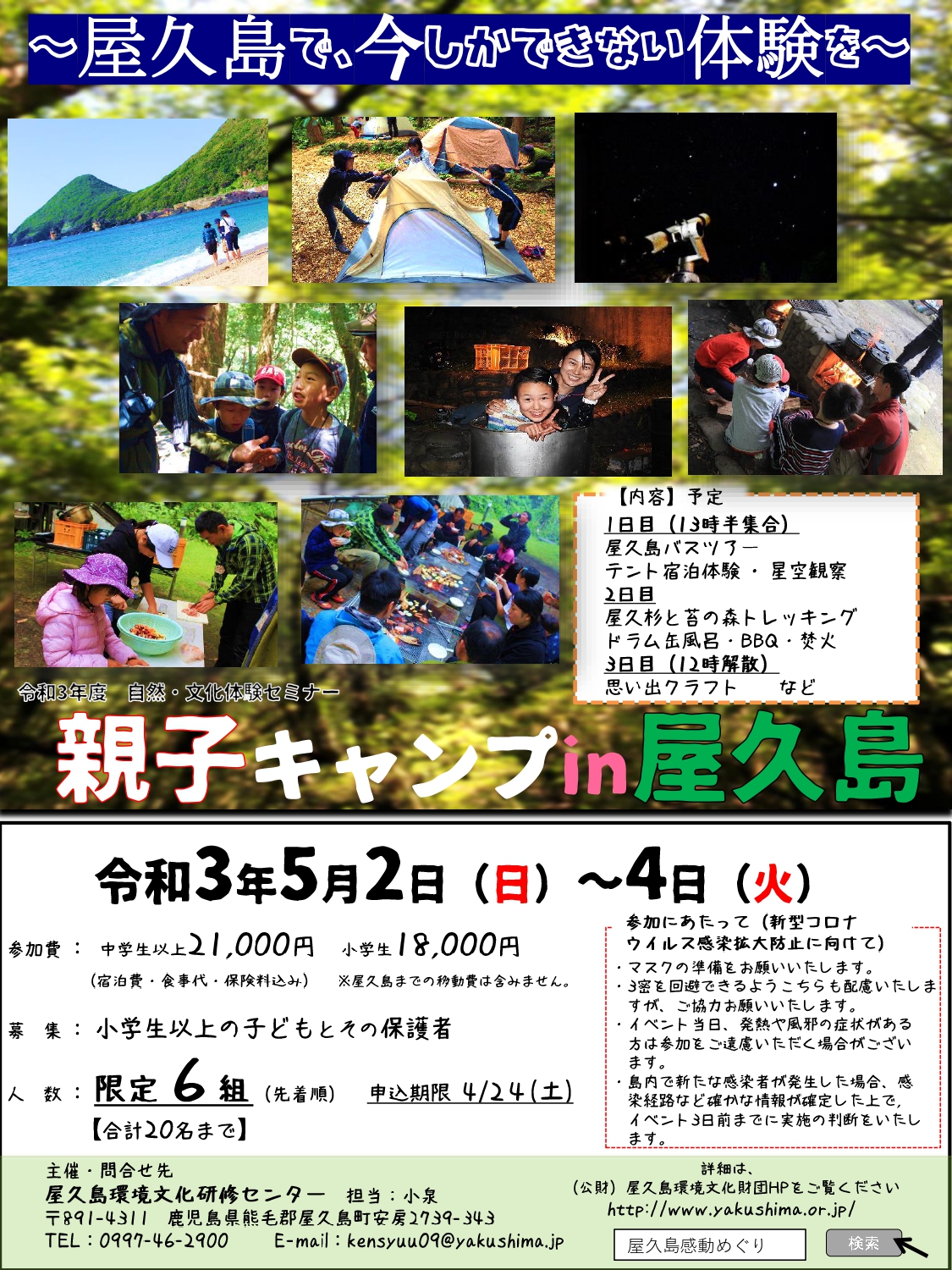 今年のゴールデンウィークは、親子で世界自然遺産 屋久島の大自然の中で、キャンプをしてみませんか?