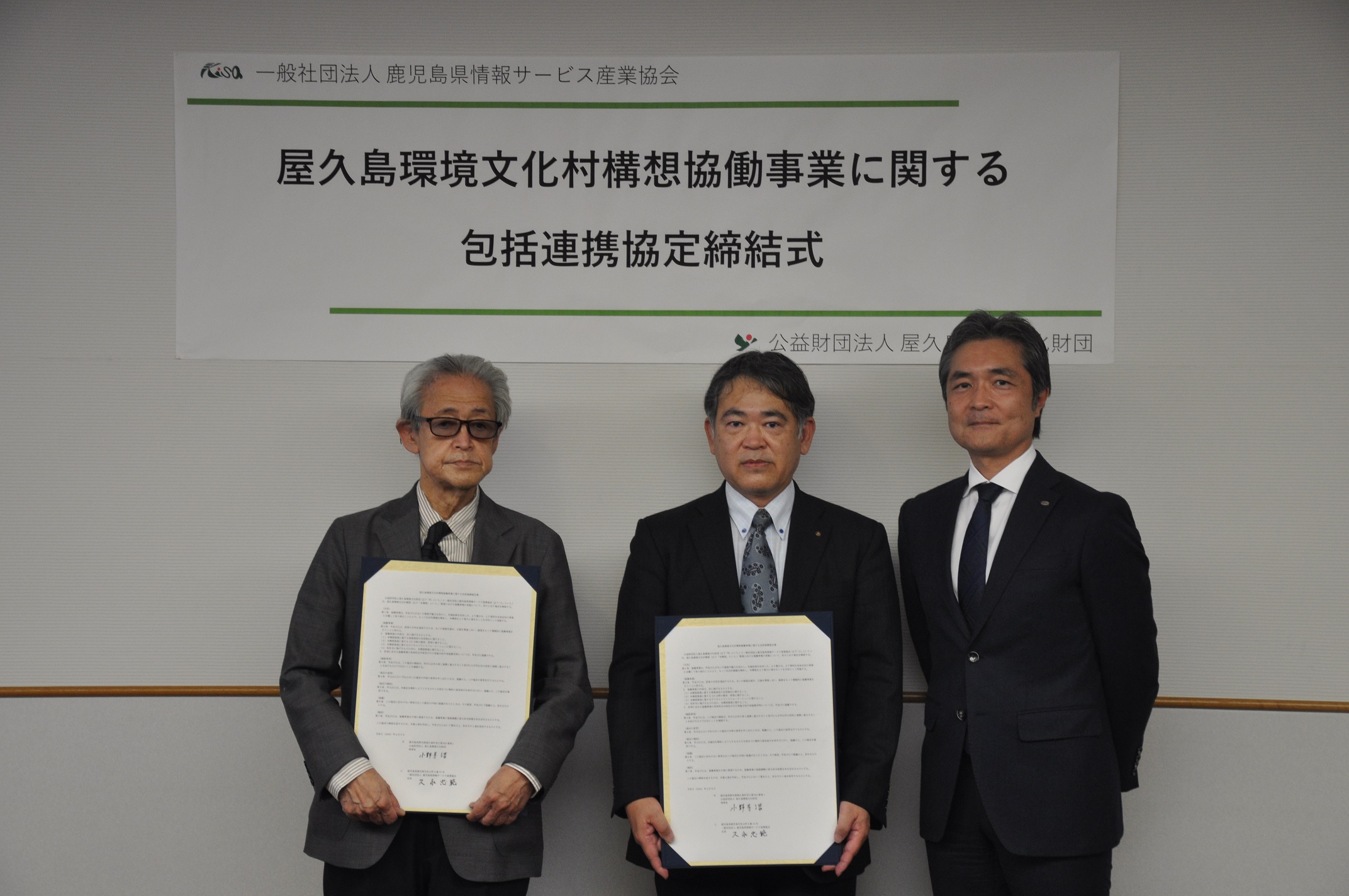 弊財団では、一般社団法人鹿児島県情報サービス産業協会(KISA)と屋久島環境文化村構想(以下「本構想」という。)を推進するために協働事業の実施について、包括連携協定を締結いたしました。