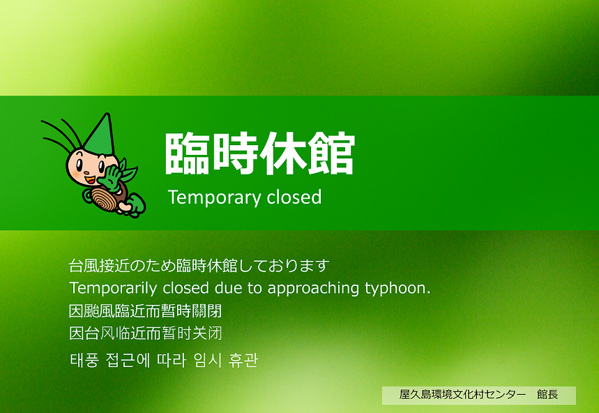 屋久島環境文化村センター・研修センターは、台風6号の接近に伴い臨時休館いたします。