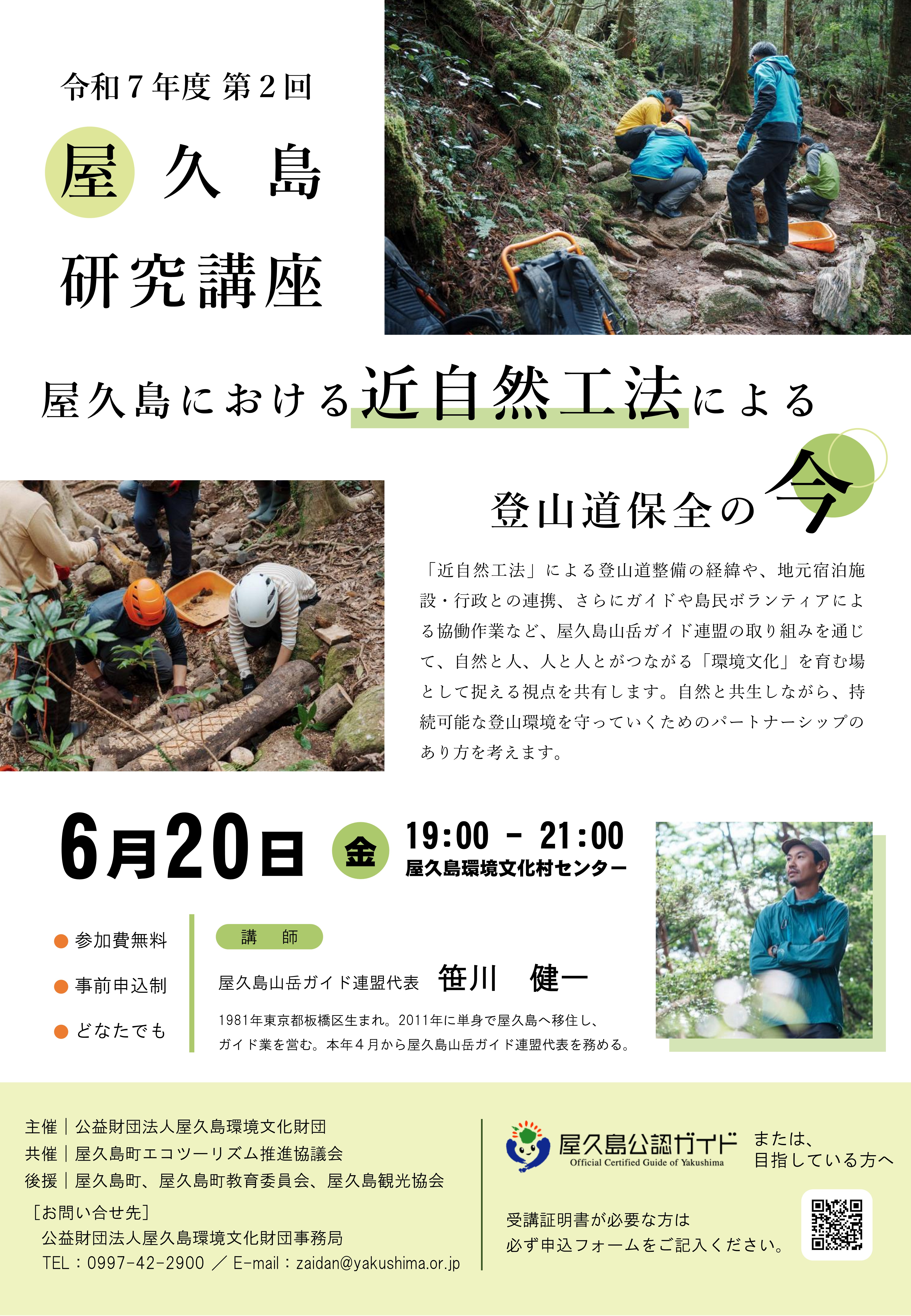 屋久島環境文化財団では、令和7年度第2回屋久島研究講座を以下のとおり開催します。