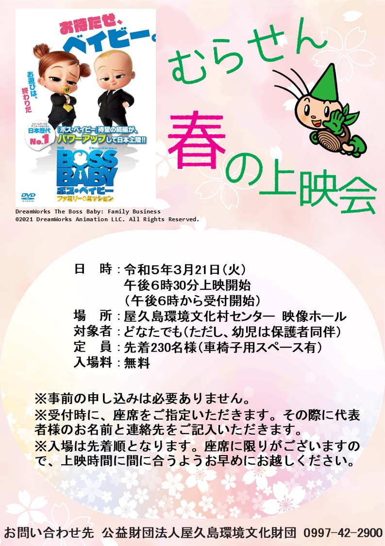 財団では、屋久島環境文化村センターにおいて、令和5年3月21日(火)午後6時30分から、無料上映会を開催します。
