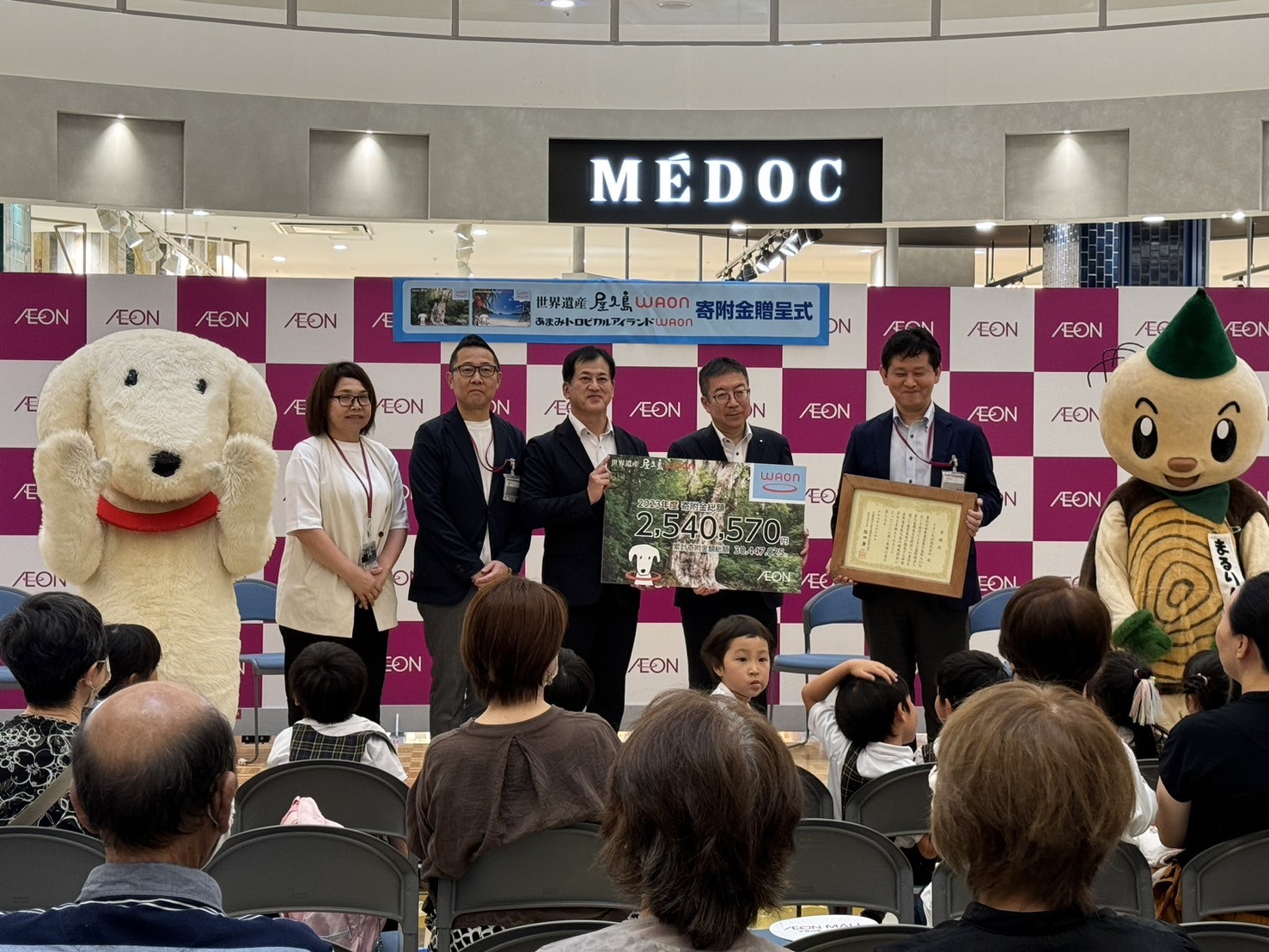 イオン九州株式会社様には、平成23年度から、電子マネー「世界遺産屋久島WAON」の利用金額の一部を、寄付金として贈呈していただいております。
