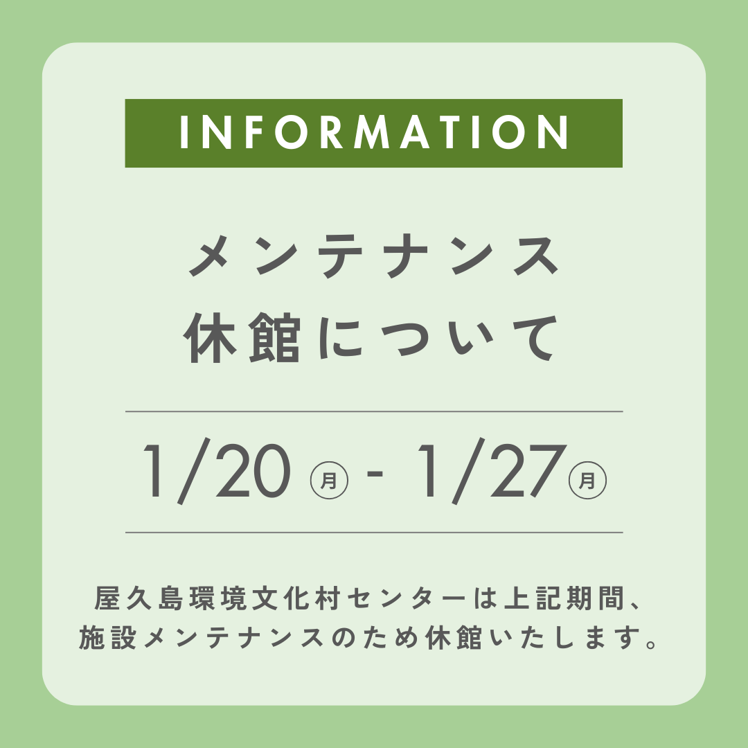 屋久島環境文化村センターでは、令和7年1月20日(月)から1月27日(月)までの間、当館の施設メンテナンスを行うため、休館いたします。
